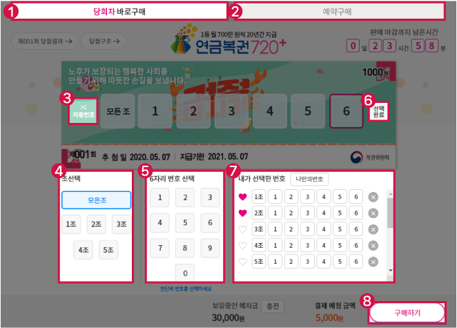 - 선택한 조와 6자리 번호를 확정합니다. - 선택한 번호가 판매된 경우, 추천 번호를 자동으로 안내합니다.